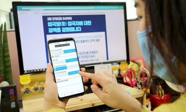 ▲서울 성동구청 직원이 지난달 27일 '코로나19' 자가격리자의 기침, 발열 등 건강 상태와 위치 이탈여부 등을 모니터링 앱을 통해 관리하고 있다. [성동구 제공]