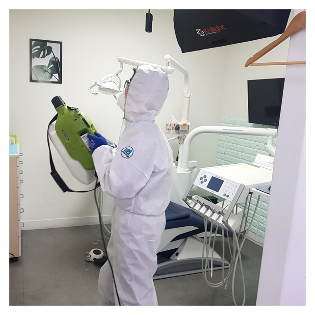 ▲ 방역업체를 통해 소독작업을 진행하고 있는 치과의 모습. [맘애든치과 제공]