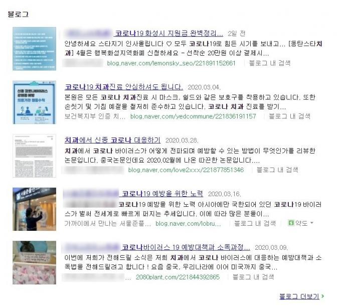 네이버에서 '코로나', '치과', '안심' 3개 키워드를 모두 포함하는 블로그를 검색해 보면 무려 4838건이 검색된다. 해당 키워드로 검색한 내용은 거의 예외 없이 '우리 치과는 코로나19 확산을 막기 위해 최선을 다하고 있다'는 것이었다.
