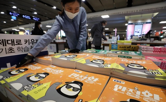 ▲ 지난 6일 오후 서울 종로구 교보문고 광화문점에서 한 직원이 EBS 초등 교재들을 정리하고 있다. [뉴시스]