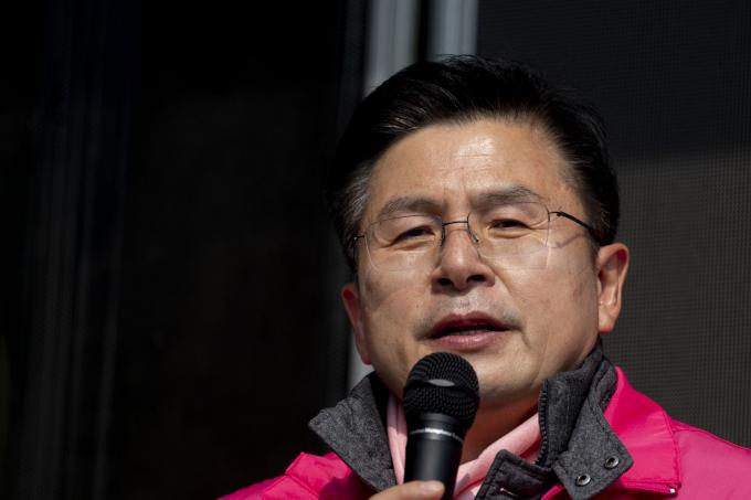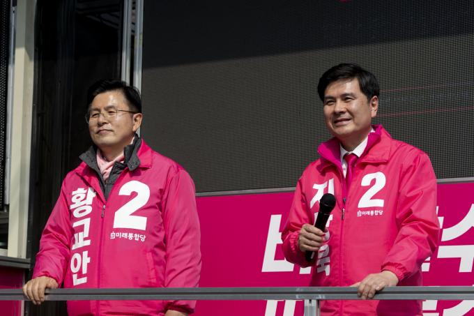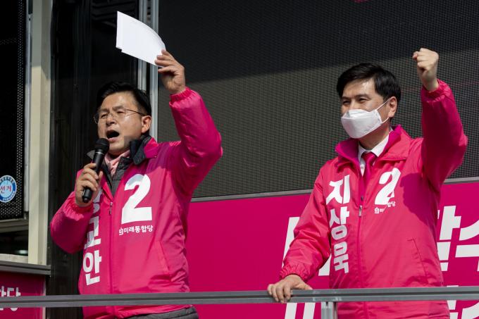 제21대 국회의원선거에서 서울 종로에 출마한 미래통합당 황교안 대표가 7일 오후 서울 중구 중앙시장 앞에서 중구성동을 지상욱 후보 지원유세를 하고 있다.