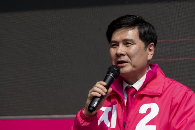 제21대 국회의원선거에서 서울 중·성동을에 출마한 미래통합당 지상욱 후보가 7일 오후 서울 중구 중앙시장 앞에서 지지를 호소하고 있다.