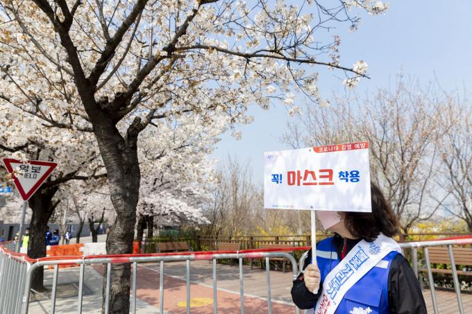 ▲ 코로나19 사태로 국회 뒤편 벚꽃길이 전면 통제되고 있는 지난 4월 3일 오후 영등포구청 관계자들이 근무를 서고 있다. [문재원 기자]