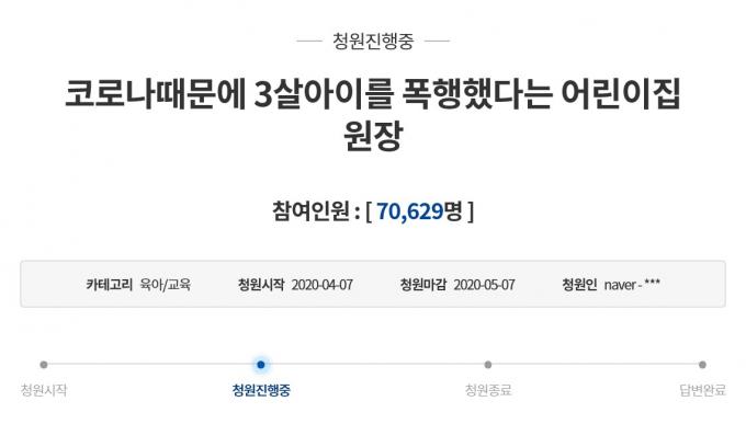 8일 청와대 국민청원 게시판에 따르면 전날(7일) '코로나 때문에 3살 아이를 폭행했다는 어린이집 원장' 제목의 청원이 올라왔다. 해당 청원은 이날 오전 10시 30분 기준 7만629명의 동의를 받았다.
