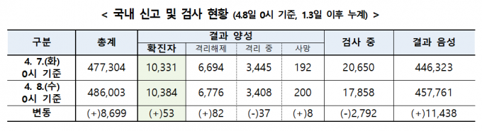 현재까지 총 48만6003명이 코로나19 진단 검사를 받았다. 이 중 45만7761명이 '음성'으로 확인됐고 1만7858명은 검사가 진행 중이다.