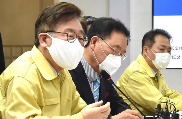 ▲ 이재명 경기도지사가 지난달 11일 오후 경기도청 상황실에서 열린 '코로나19' 위기 극복을 위한  경기도 기독교 교회 지도자 긴급 간담회'에서 모두발언을 하고 있다. [뉴시스]