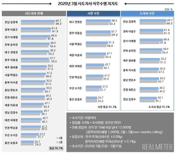 리얼미터 측은 "지지도가 오른 시도지사의 다수가 코로나 사태 대응에 따른 영향이 있었던 것으로 보인다"고 설명했다.