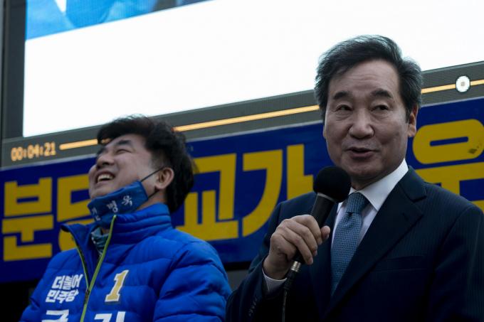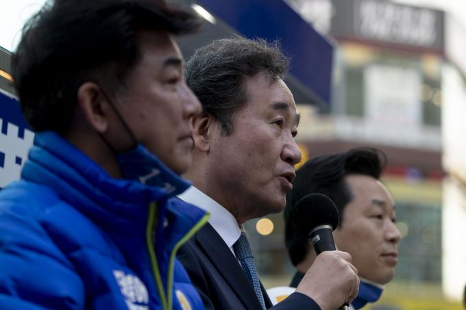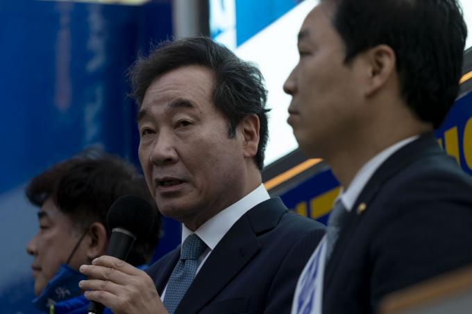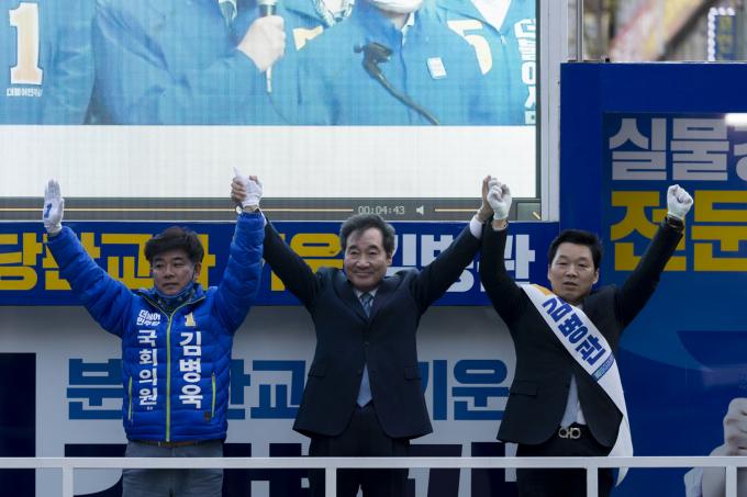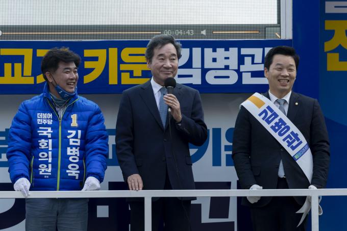 더불어민주당 이낙연 공동상임선대위원장이 8일 오후 경기 성남시 수내동에서 분당갑 김병관-분당을 김병욱 후보의 지원유세를 하고 있다.