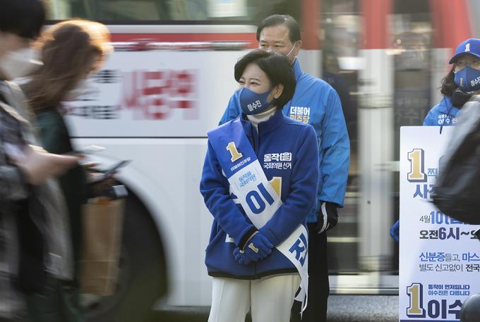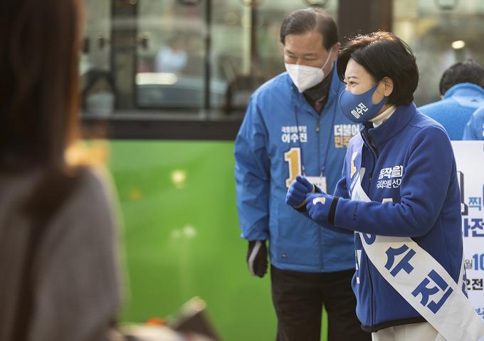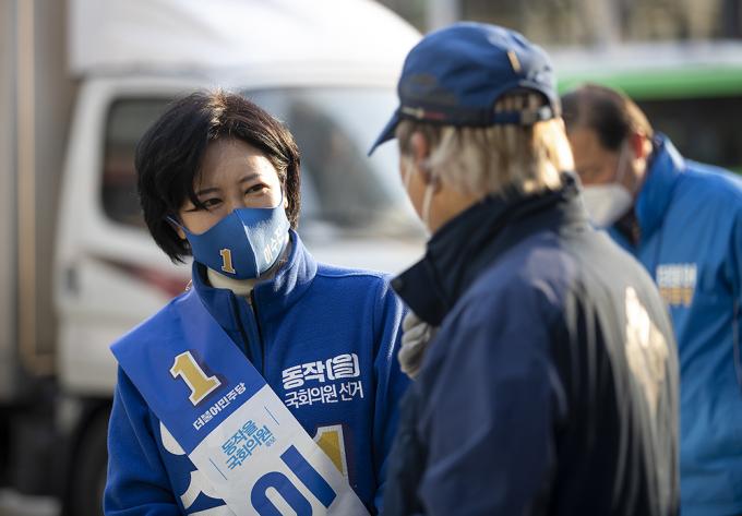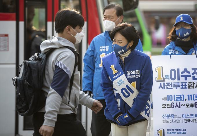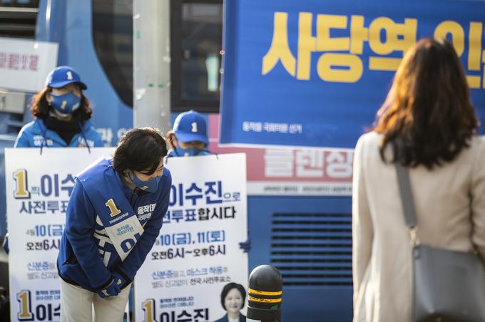 4·15 제21대 국회의원선거 서울 동작을에 출마한 더불어민주당 이수진 후보가 9일 오전 서울 동작구 사당역에서 시민들에게 아침 출근인사를 하고 있다.