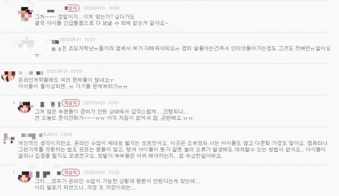 ▲ 온라인 수업에 대해 걱정하는 목소리가 담긴 웹 게시물과 댓글. 다문화 가정의 경우 어려운 점이 있다고 지적하고 있다. [웹 사이트 캡처]