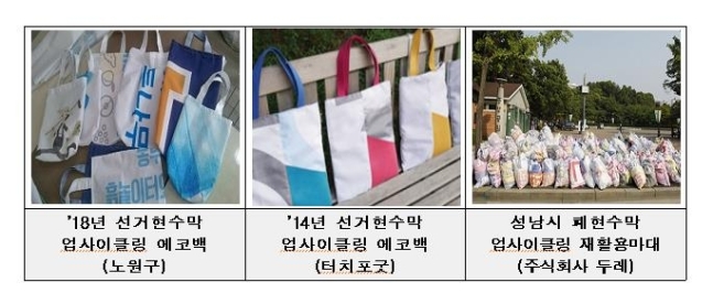 현수막 재활용 우수사례를 축적해 점진적으로 재활용률을 높이는 정책에도 활용한다. 실제로 지난 2018년 전국에서 발생한 폐현수막 9220t 중 △ 재활용 3093t(33.5%) △ 소각처리 5649t(61.3%) △ 기타 478t(5.2%) 순으로 처리됐다.