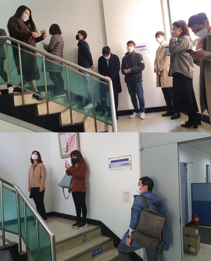 선거 진행을 돕는 관계자들은 아무래도 거리 두기에 한계가 있어 보였다. 다들 마스크를 꼼꼼히 착용한 상태였지만, 다닥다닥 붙어 앉아 있었다.
