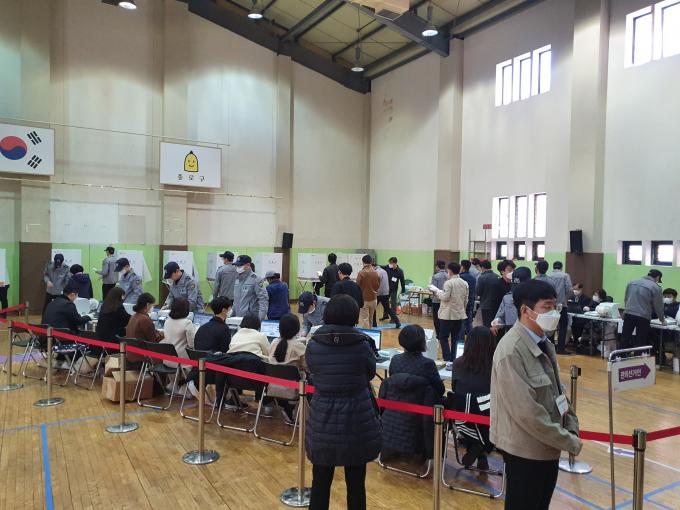 쭉 걸어들어가 투표장소인 종로구청 제2별관에 도착했다. 투표소는 3층에 있다. 올라가는 계단에는 투표를 하러 온 시민들이 줄을 서 기다리고 있었다. 줄은 3층 투표소에서 1층까지 이어졌다.