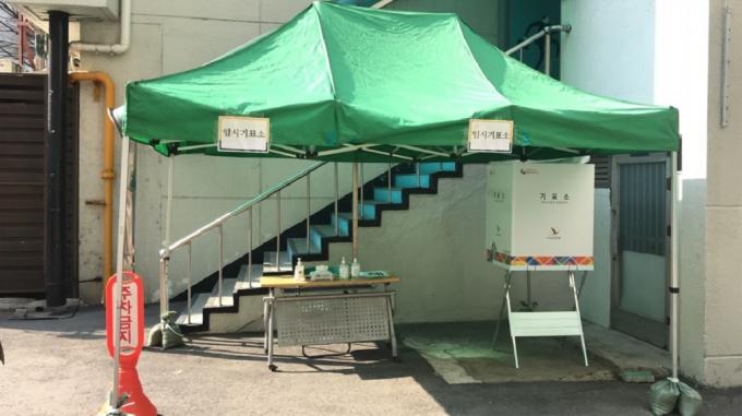 나오는 길에는 임시기표소가 설치된 모습을 볼 수 있었다. 임시기표소는 마스크가 없거나 발열 증세가 있는 선거인을 위해 마련된 장소다. 임시기표소는 대기하는 관계자도 없이 휑했다.