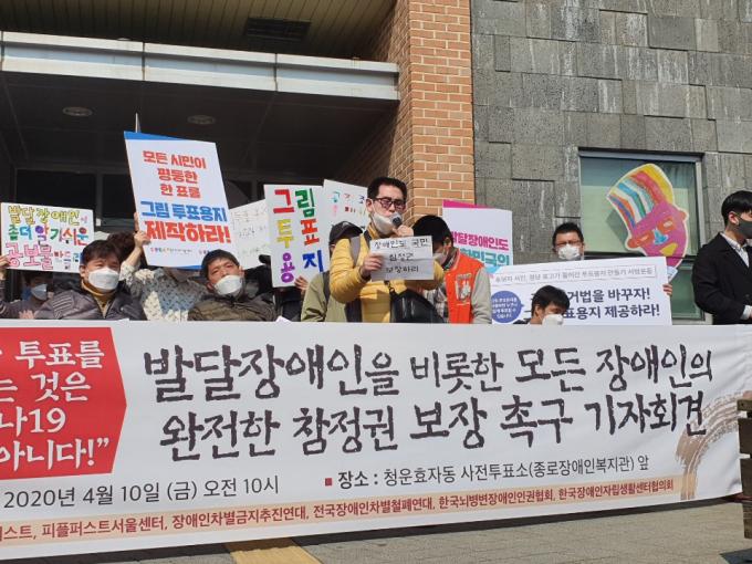 한국피플퍼스트, 피플퍼스트서울센터, 장애인차별금지추진연대, 전국장애인차별철폐연대 등은 10일 종로장애인복지관 앞에서 기자회견을 열고 장애인의 참정권을 위해 선거관리위원회에서 필요한 모든 조치를 이행해줄 것을 촉구했다.