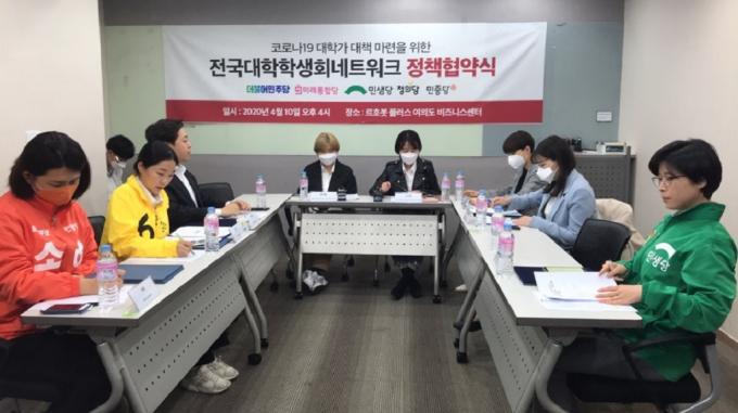 전국대학학생회네트워크(전대넷)과 더불어민주당·미래통합당·민생당·정의당·민중당 청년 대표들은 10일 오후 4시 서울 영등포구 르호봇 플러스 여의도 비즈니스센터에서 '코로나19 대학가 대책 마련을 위한 전대넷-정당 정책 협약식'을 열었다.