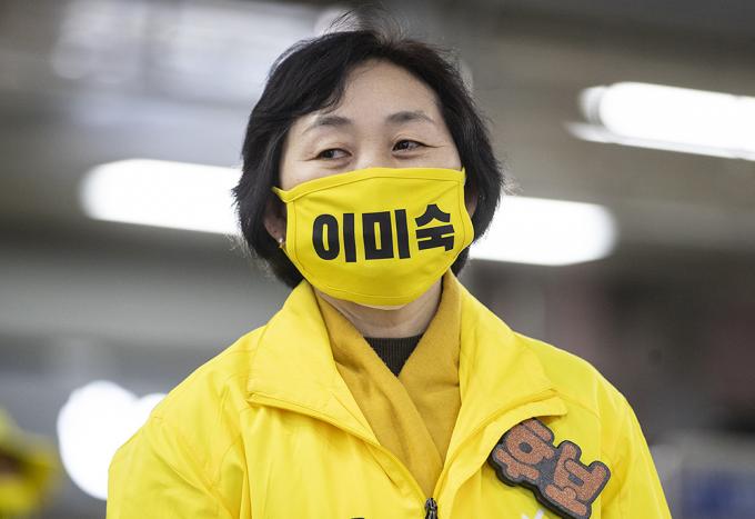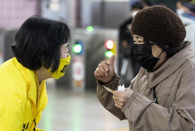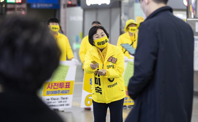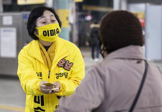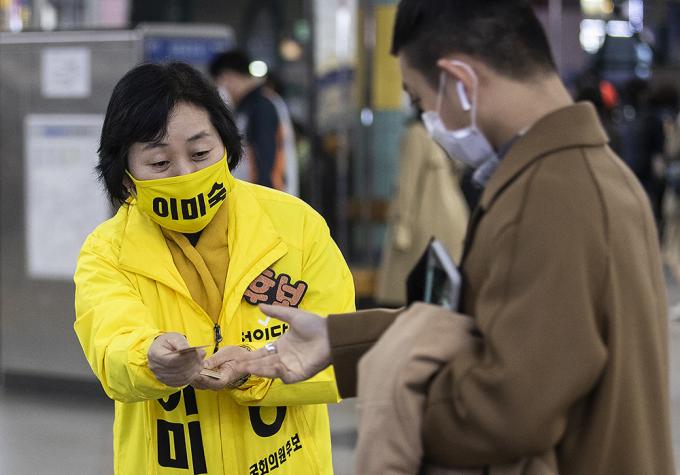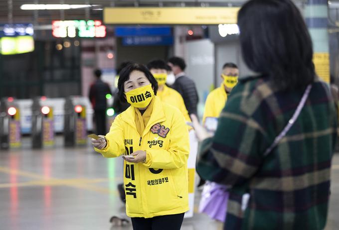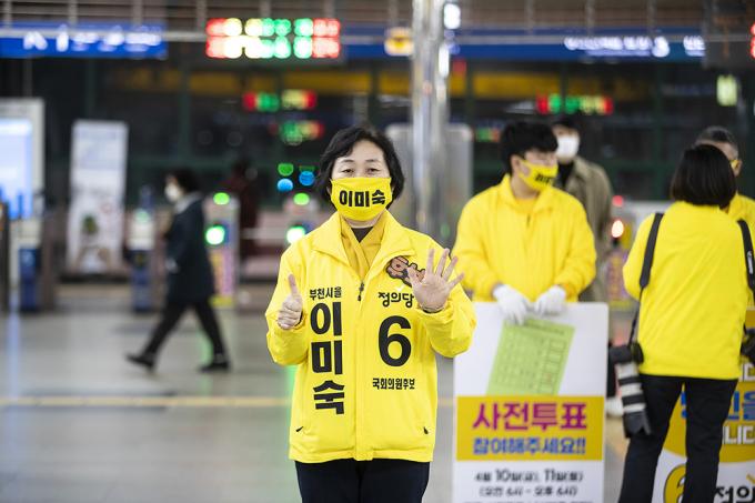 4·15 제21대 국회의원선거 경기 부천을에 출마한 정의당 이미숙 후보가 10일 오후 경기 부천시 송내역에서 퇴근하는 시민들에게 지지를 호소하고 있다.