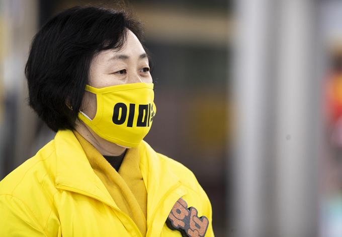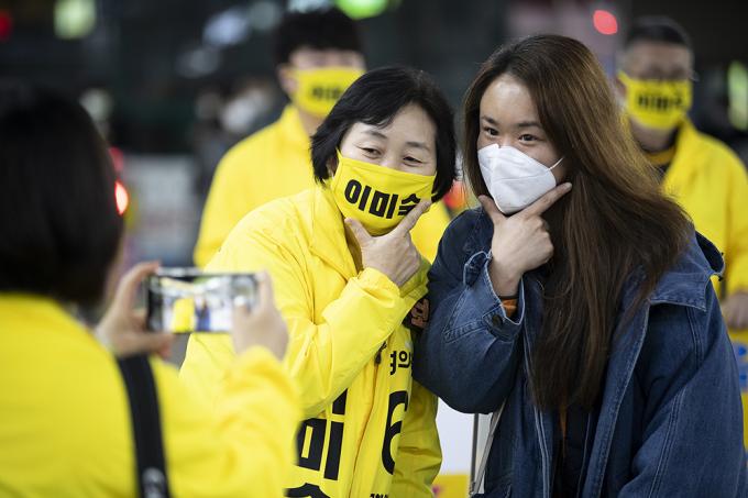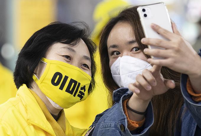 4·15 제21대 국회의원선거 경기 부천을에 출마한 정의당 이미숙 후보가 10일 오후 경기 부천시 송내역에서 퇴근길 인사 중 마스크를 쓴 채 시민과 인증샷을 찍고 있다.