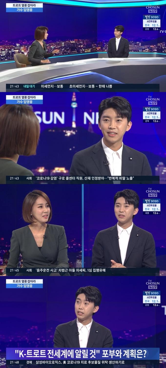 임영웅은 10일 밤 방송된 TV조선 뉴스프로그램 '뉴스9'에 출연해 윤우리 앵커와 대화 나눴다. 지난달 16일 영탁, 이찬원과 함께 출연한 그는 한 달여 만에 혼자 출연해 인터뷰를 가졌다.