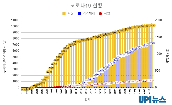 사망자는 전날 대비 3명이 늘어 총 211명이다. 확진자 대비 사망자 비율인 치명률은 2.01%로, 처음 2%대를 돌파했다.