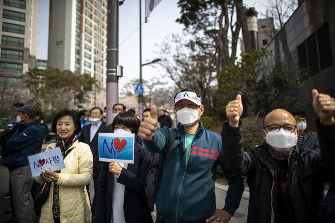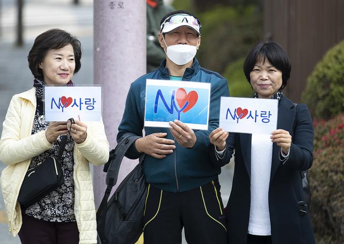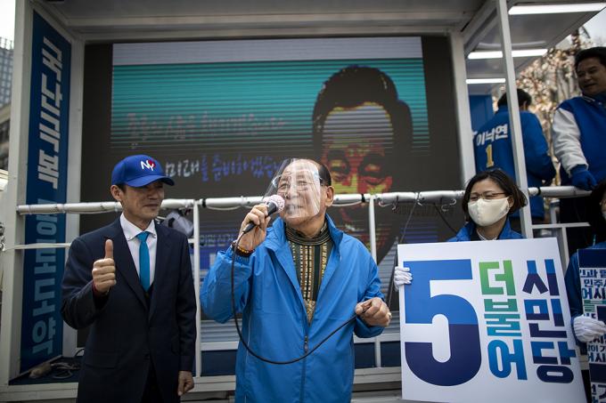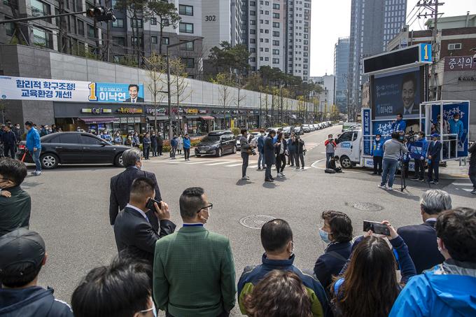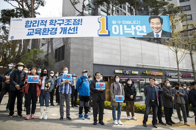11일 오전 서울 종로구 경희궁자이 상가 앞에서 열린 더불어민주당 서울 종로 이낙연 후보의 선거유세 현장에서 지지자 및 시민들이 이 후보를 응원하고 있다.