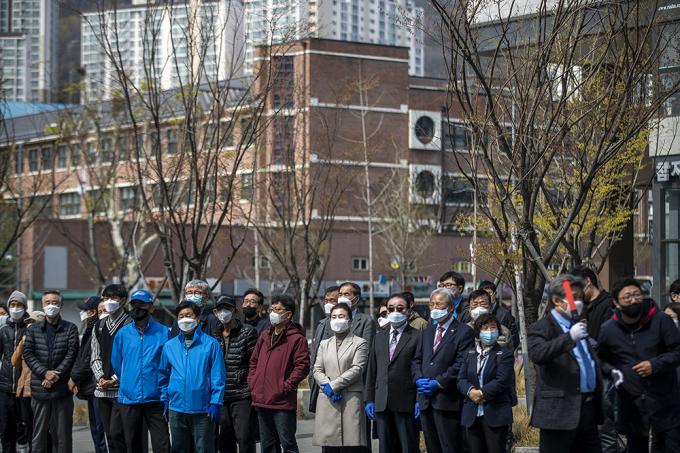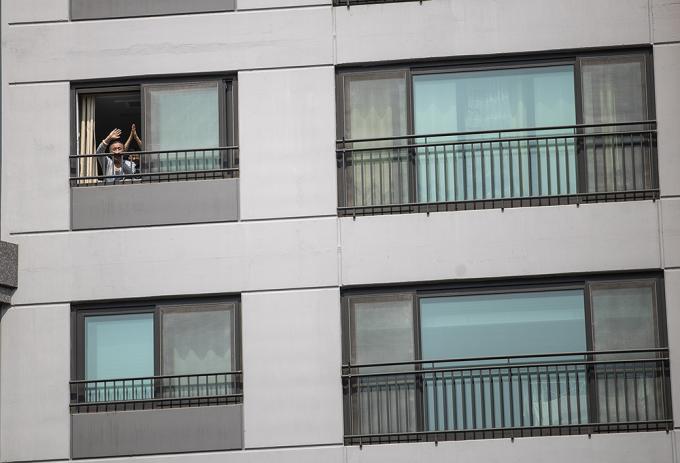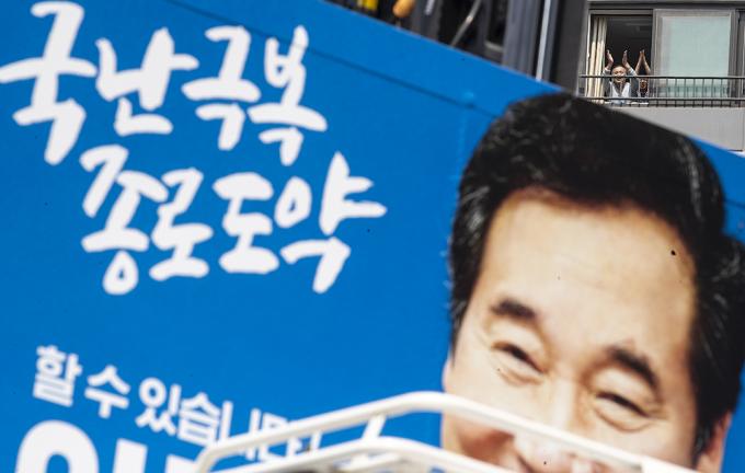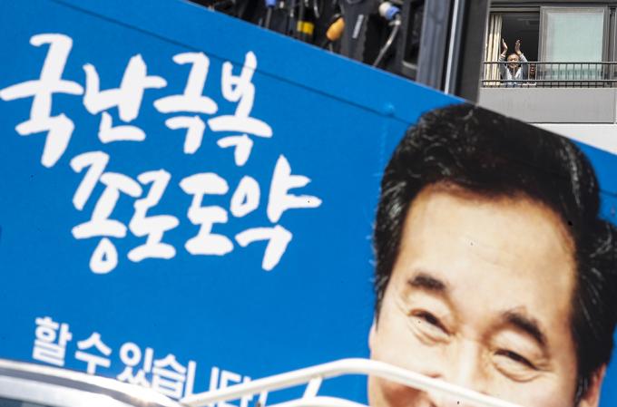 4·15 제21대 국회의원선거 서울 종로에 출마한 더불어민주당 이낙연 후보가 11일 오전 서울 종로구 경희궁자이 상가 앞에서 선거유세를 하는 가운데 인근 아파트에서 창문을 통해 현장을 바라보던 주민들이 박수를 치고 있다.