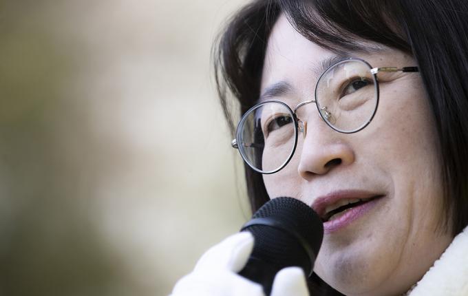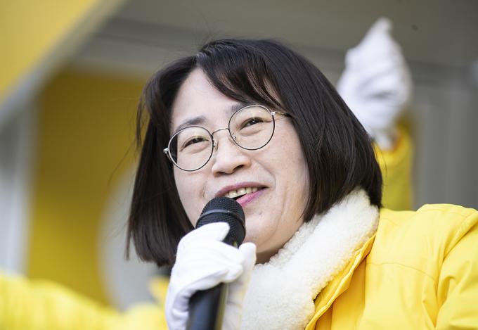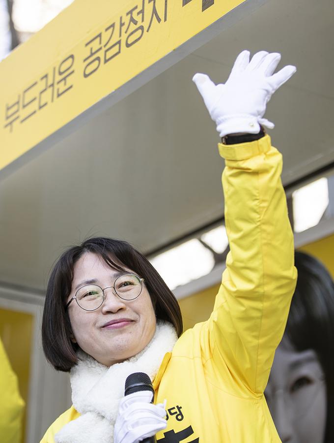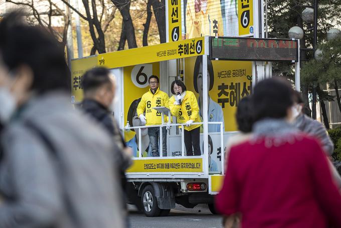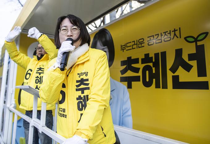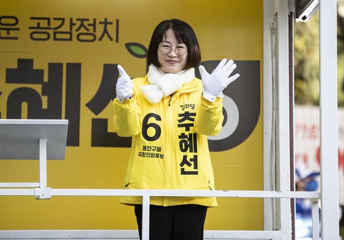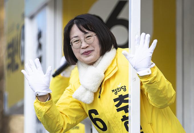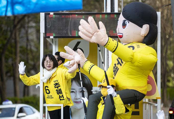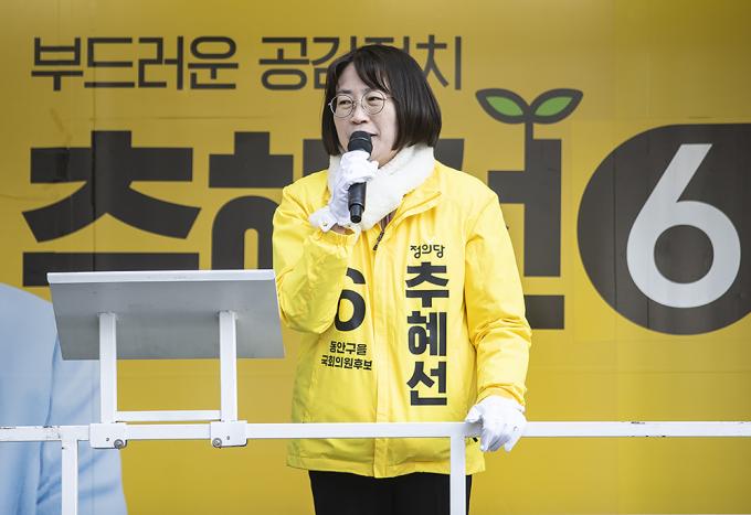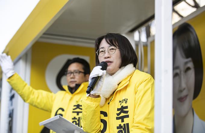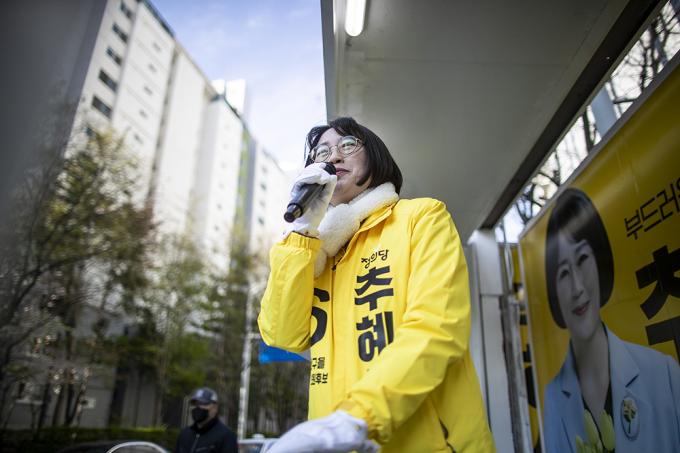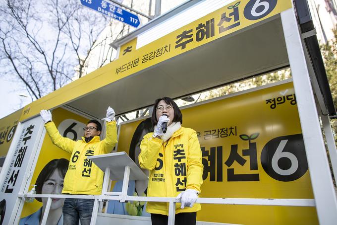 4·15 총선에서 경기 안양 동안을에 출마한 정의당 추혜선 후보가 13일 오전 경기 안양 동안구 범계역에서 출근하는 시민들에게 지지를 호소하고 있다.