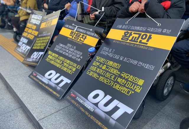 ▲ 전국장애인차별철폐연대가 13일 오후 국가인권위원회 앞에서 기자회견을 진행하기 전 가지고 온 팻말을 들고 있다. 해당 팻말은 공직선거법 위반 소지가 있는 내용이 포함 돼 기자회견을 시작하기 전 치워졌다. [뉴시스]