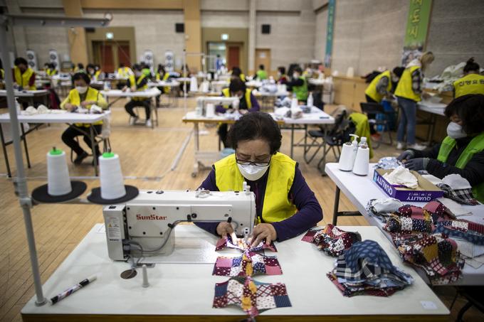 ▲코로나19 극복 '노원 면마스크 의병단'이 3월 18일 오전 서울 노원구청 대강당에서 친환경 수제 면마스크를 제작하고 있다. [정병혁 기자]