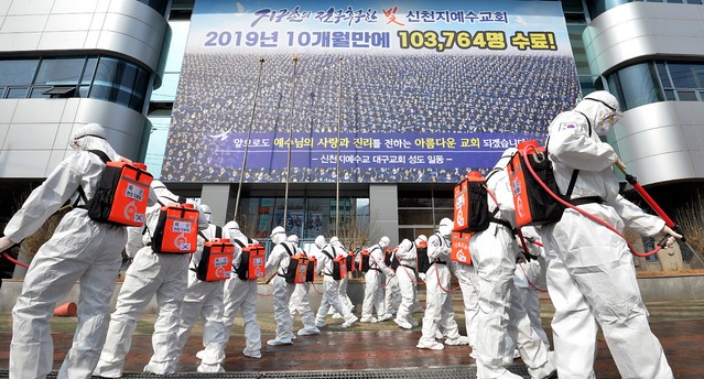 ▲ 지난 3월 1일 오후 대구 남구 대명동 신천지 대구교회 앞에서 육군 제2작전사령부 소속 19화생방대대 장병들로 구성된 육군 현장지원팀이 방역작전을 펼치고 있다. [뉴시스]