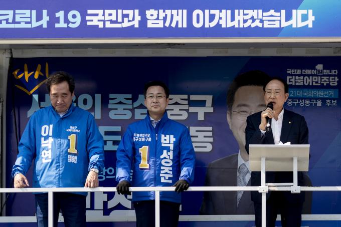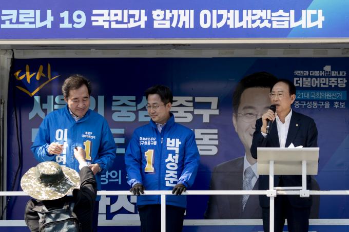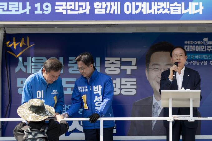 제21대 국회의원선거에서 서울 종로에 출마한 더불어민주당 이낙연 후보가 14일 오후 서울 종로5가 마전교에서 최운열 의원, 중구성동을 박성준 후보와 합동 유세 중 시민에게 사인을 해주고 있다.