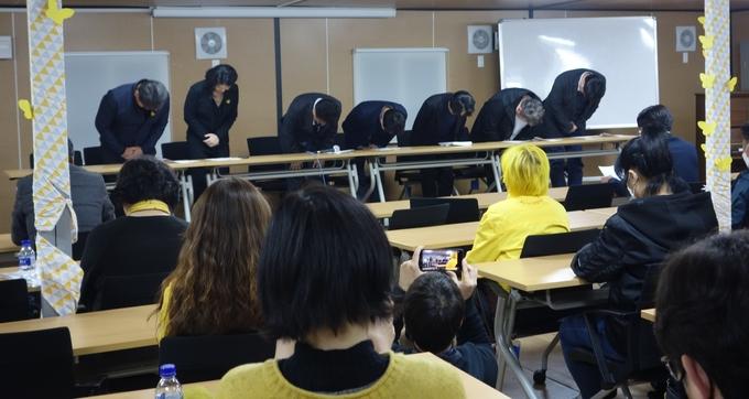 이어 "보도 참사에 대한 진정한 사과는 6년이 지난 지금에서야 실천한다. 전국 1만여 기자들을 회원으로 둔 한국기자협회는 6년 전 세월호 보도 참사를 뒤늦게나마 사과하기 위해 이 자리에 섰다"며 "자식을 잃고 절망에 빠진 유족들을 두 번 울린 보도 참사에 대해 머리 숙여 진심으로 사과드린다"고 말했다.