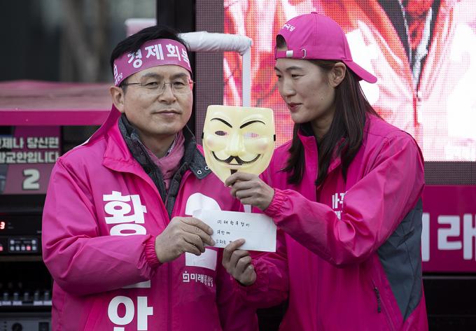 4·15 제21대 국회의원선거 서울 종로에 출마한 미래통합당 황교안 후보가 선거유세 마지막날인 14일 오후 서울 종로구 평창동에서 미래한국당 김은희 비례대표 후보로부터 '위선의 가면과 국민에게 보내는 편지'를 전달받고 있다.