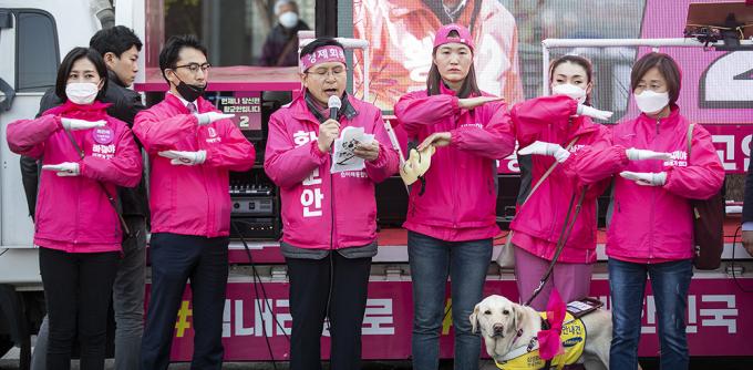 4·15 제21대 국회의원선거 서울 종로에 출마한 미래통합당 황교안 후보가 선거유세 마지막날인 14일 오후 서울 종로구 평창동에서 '국민에게 보내는 편지'를 읽고 미래한국당 비례대표 후보들이 평등을 요구하는 퍼포먼스를 하고 있다.