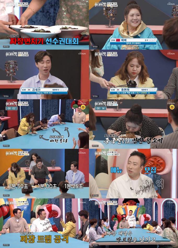 지난 14일 밤 방송된 TV조선 예능프로그램 '아내의 맛'에서는 출연진 중 홍현희, 함소원의 중국 시어머니, 김세진이 스튜디오에서 짜장면 빨리 먹기 대결을 하는 모습이 그려졌다.