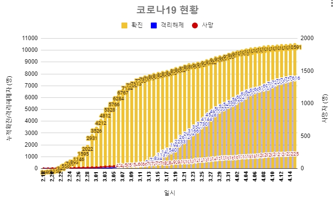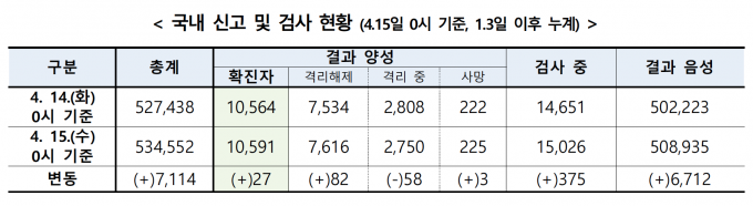 중앙방역대책본부(방대본)은 15일 0시 기준 코로나19 확진자가 전날 0시보다 27명 증가했다고 밝혔다. 국내 총 확진자 수는 1만591명으로 집계됐다.