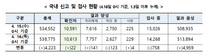 중앙방역대책본부는 16일 0시 현재 코로나19 신규 확진자가 22명을 기록해 전체 누적 확진자는 모두 1만613명으로 집계됐다고 밝혔다.
