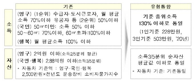 현재 공공임대주택은 영구·국민·행복 등 유형별로 다양하고 입주자격도 각각 다른데 수요자인 저소득층이 쉽게 이용할 수 있도록 이를 하나로 통합한다.