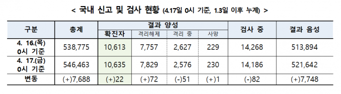 중앙방역대책본부은 17일 0시 기준 코로나19 확진자가 전날 0시보다 22명 증가했다고 밝혔다.