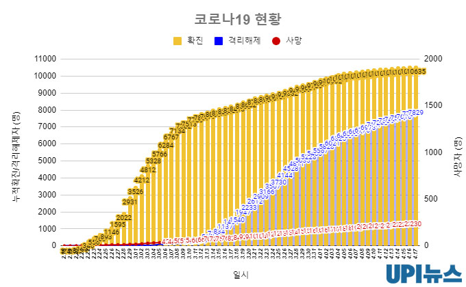 이와 함께 완치해 격리 해제된 확진자는 전날 72명이 늘어 총 7829명으로 집계됐으며, 격리 치료를 받는 환자 수는 2576명으로 51명이 줄었다.