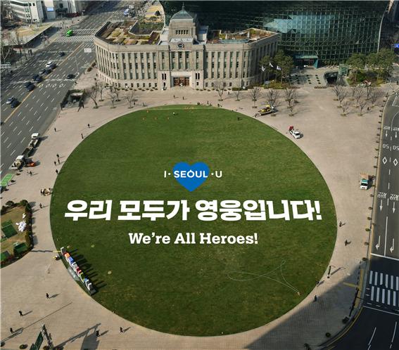 서울광장 잔디밭에는 코로나19 극복을 위해 사회적 거리두기 등에 적극 동참한 서울시민에 대한 감사의 마음을 담아 "우리 모두가 영웅(We're All Heroes!)"이라는 메시지를 24일부터 시각적으로 표현한다.