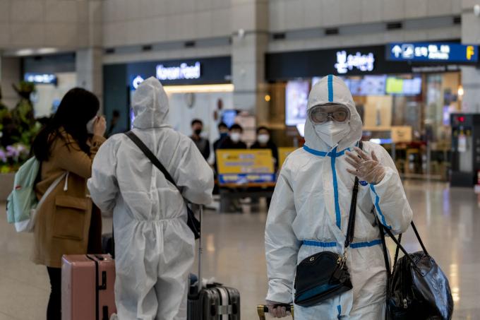 ▲ 코로나19 사태가 지속되고 있는 지난달 27일 오후 인천국제공항 제1터미널에서 마스크와 방진복을 착용한 외국인 관광객들이 발걸음을 옮기고 있다. [문재원 기자]