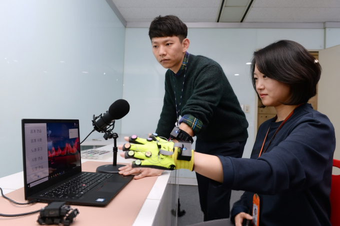 ▲ 촉각으로 소리 인식하는 기술 시연하는 ETRI 연구진의 모습. [ETRI 제공]