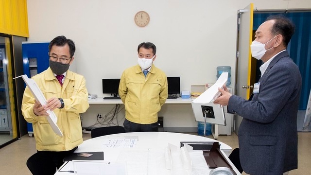 ▲ 홍정기 환경부 차관이 지난 21일 인천 서구 환경산업연구단지 내 환경벤처기업을 방문해 코로나19로 인한 현장의 어려움을 듣고 관계자들을 격려하고 있다. [환경부 제공]