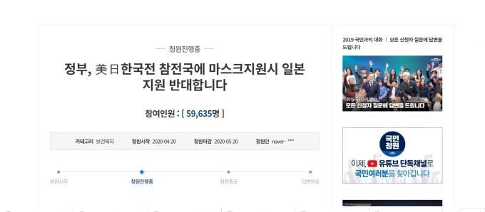 가장 많은 사람이 공감한 청원인 '정부, 美日한국전 참전국에 마스크 지원 시 일본 지원 반대합니다'라는 제목의 글은 현재 청원 수 5만9000여 명으로 6만 명을 눈앞에 두고 있다.