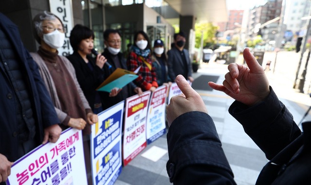 이날 기자회견에서 청각장애인 강재희씨는 수화를 통해 "농인(청각장애인)의 언어는 수화"라면서 "하지만 KT 광고를 보면 농인들이 수어가 아닌 음성언어를 원하는 것처럼 보일 위험이 있다"고 말했다.