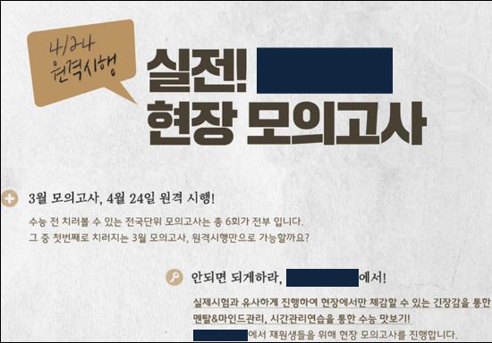 사걱세는 "이러한 업체들은 재택 시험보다 현장 시험의 중요성을 강조하며 자체 블로그, 맘카페, 문자메시지 등을 통해 사전 모집 광고를 냈다"며 "일부 업체는 작년 수능 만점자까지 섭외해 현장에서 함께 학평을 보게 한다"고 전했다.