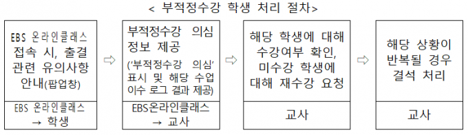 마지막 단계는 교사의 사후조치다. 교사는 의심 학생에게 강의내용을 질의해 수강 여부를 확인한 뒤 부적정 수강이 확인되면 재수강을 요청한다. 이후에도 같은 상황이 반복되면 해당 학생을 결석 처리할 수 있다.