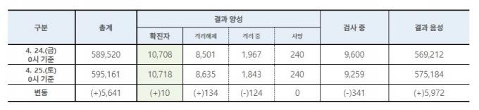 질병관리본부 중앙방역대책본부는 25일 0시 기준 코로나19 누적 확진자 수는 신규 확진자 10명을 포함해 1만718명이라고 밝혔다.