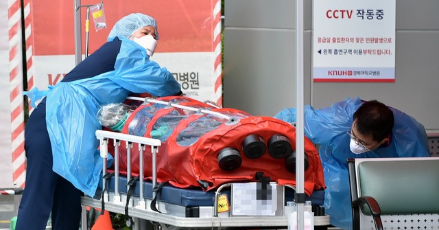 ▲ 대구 중구 경북대학교병원에서 의료진들이 지난 23일 이동식 음압 카트로 코로나19 확진자를 이송하고 있다. [뉴시스]